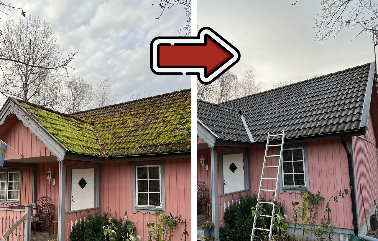 Tässä näet hellävaraisen katonpesumme ja kattokäsittelymme tuloksen – poistamme tehokkaasti sammaleen, levän ja jäkälän antaen katolle uuden elämän.